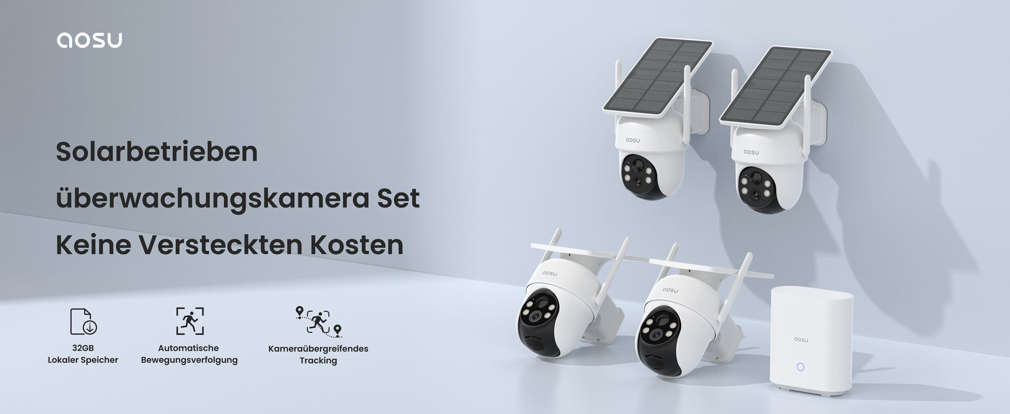 Mit nur einem Basisstation, das mit Ihrem Heim-WiFi-Router verbunden ist, können 4 aosu SolarCam D1 Classic Kit zusammenarbeiten. (unterstützt 2,4 GHz und 5 GHz WLAN) .