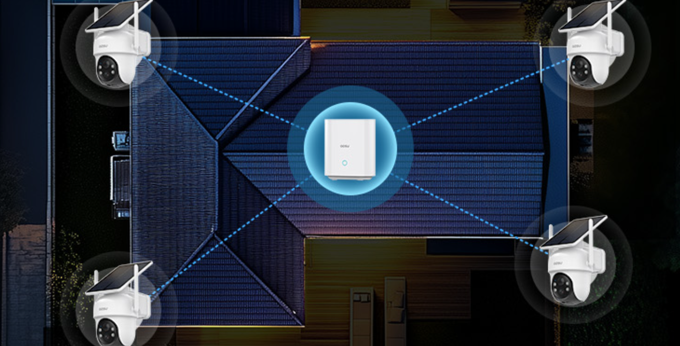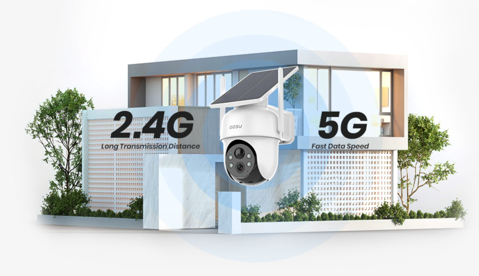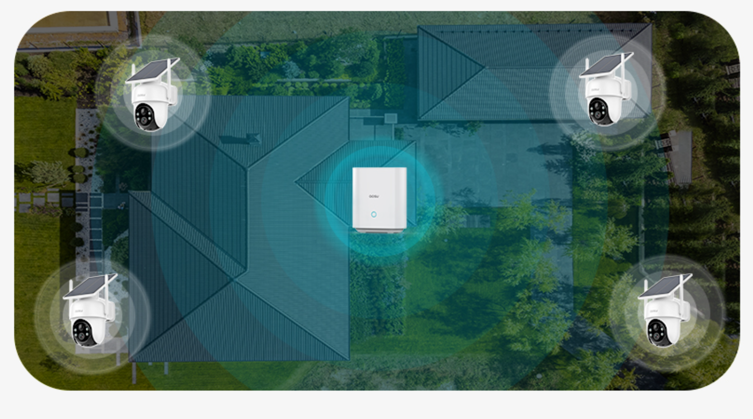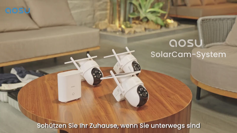 Mit nur einem HomeBase, das mit Ihrem Heim-WiFi-Router verbunden ist, können 4 aosu SolarCam D1 Classic Kit zusammenarbeiten. (unterstützt 2,4 GHz und 5 GHz WLAN) .