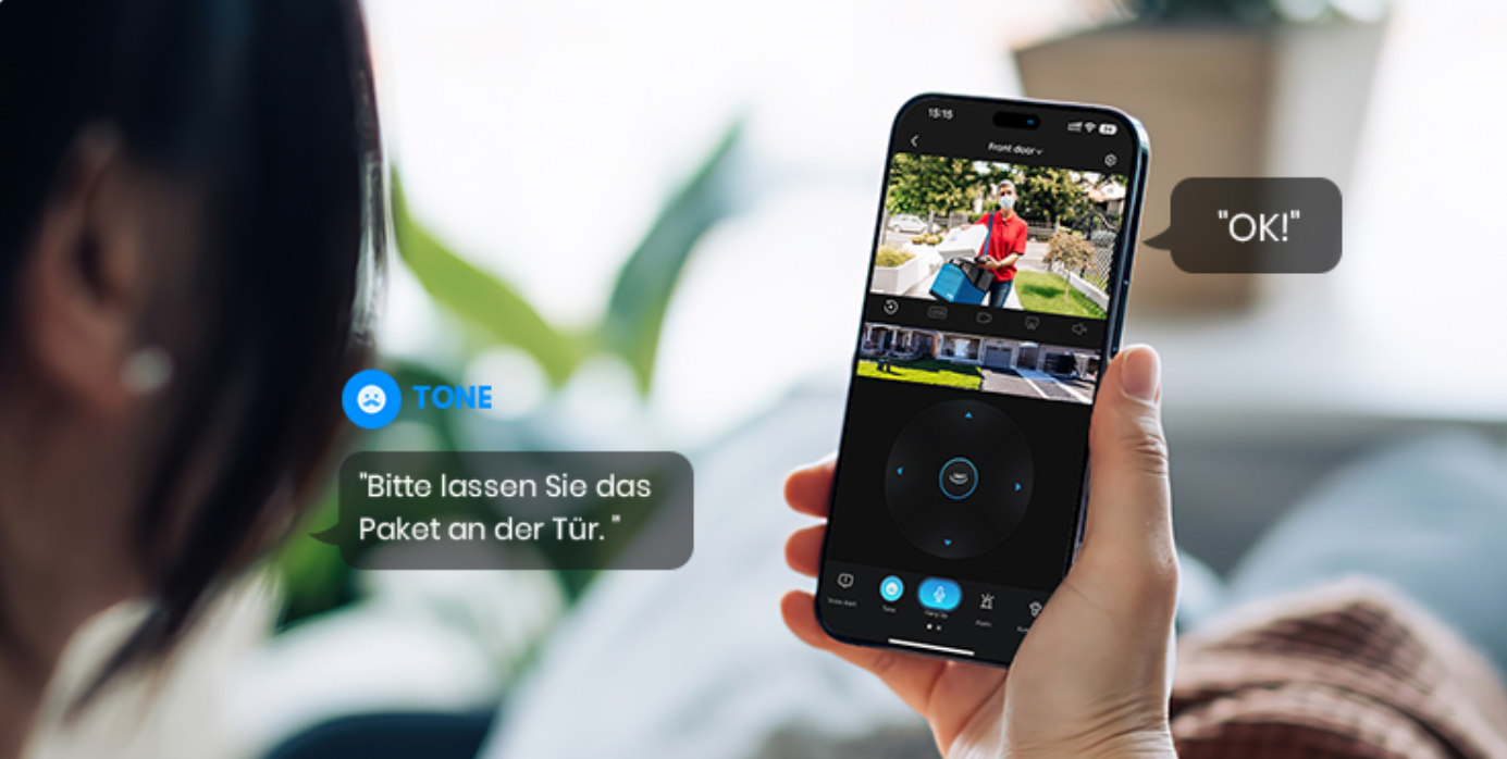 Kommunizieren Sie per Spracheingabe oder voreingestellten Warnmeldungen mit Besuchern.
