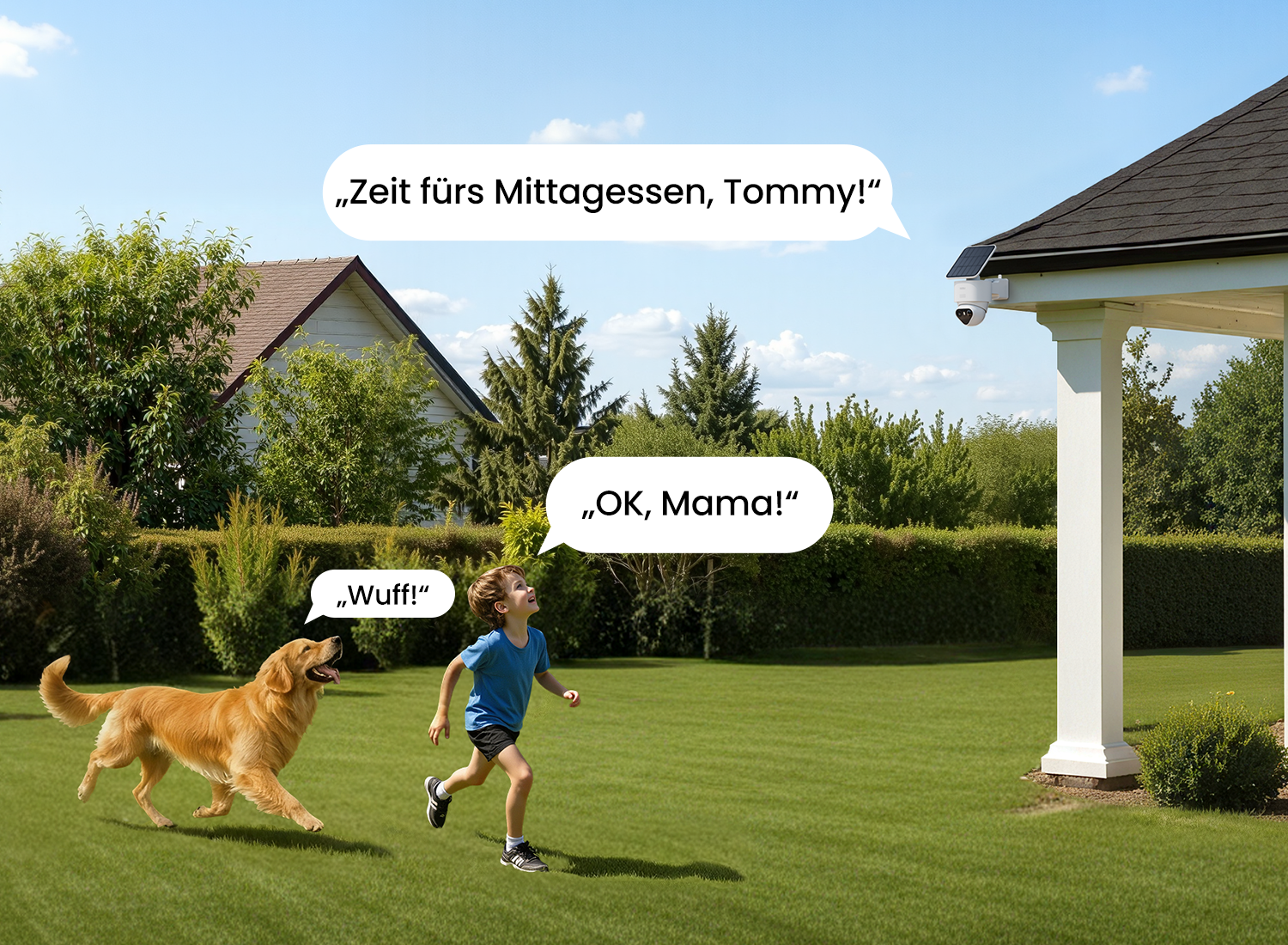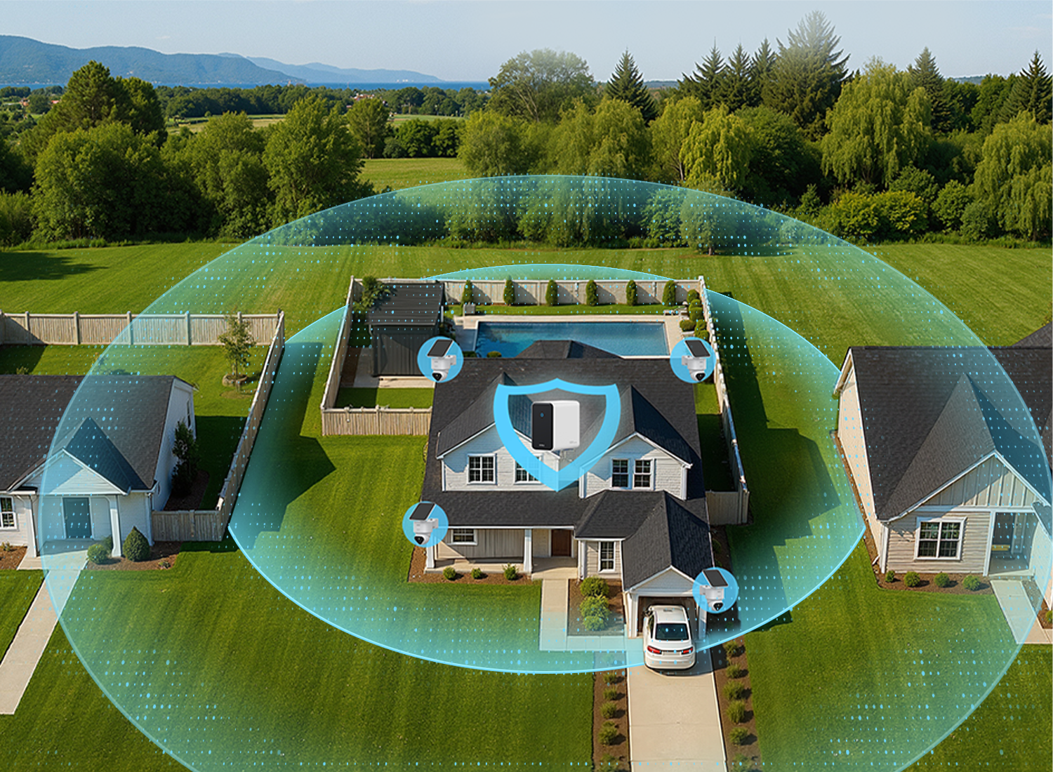 Die Kameras arbeiten zusammen, um Bewegungen rund um Ihr Grundstück zu verfolgen. Eine Kamera setzt genau dort fort, wo die andere aufgehört hat, wie Sicherheitskräfte, die jede Ecke überwachen.