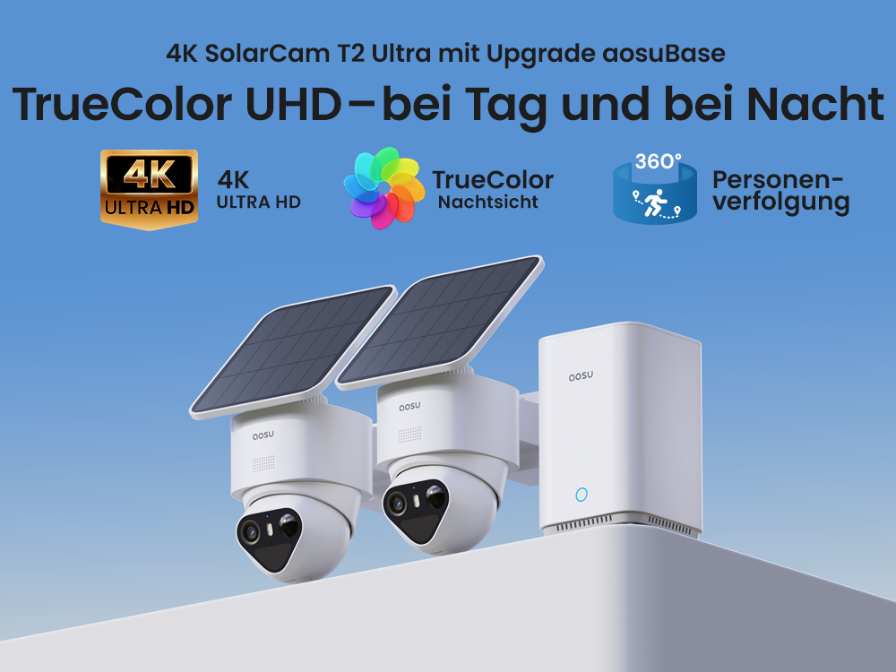 - 【Einfache Installation, Dauerbetrieb】 Richten Sie Ihre Kamera in wenigen Minuten ein – ganz ohne Fachkenntnisse. Jede Kamera wird mit Solarenergie betrieben, und abnehmbare Paneele erleichtern die Wartung. Schließen Sie die Kameras einfach an die aosuBase 2.0 an, und Ihr System überwacht Ihr Grundstück mühelos – Tag und Nacht, bei jedem Wetter.