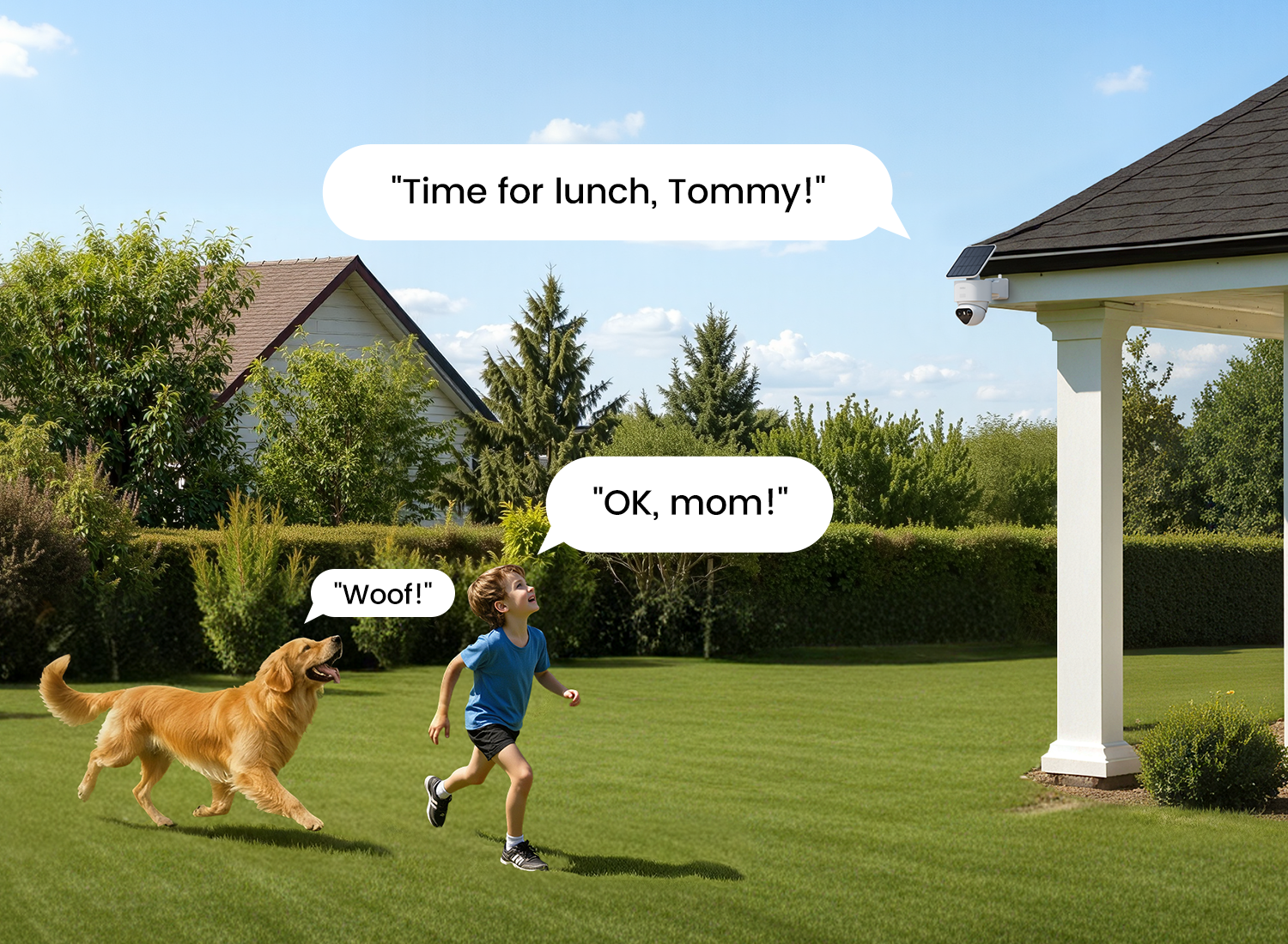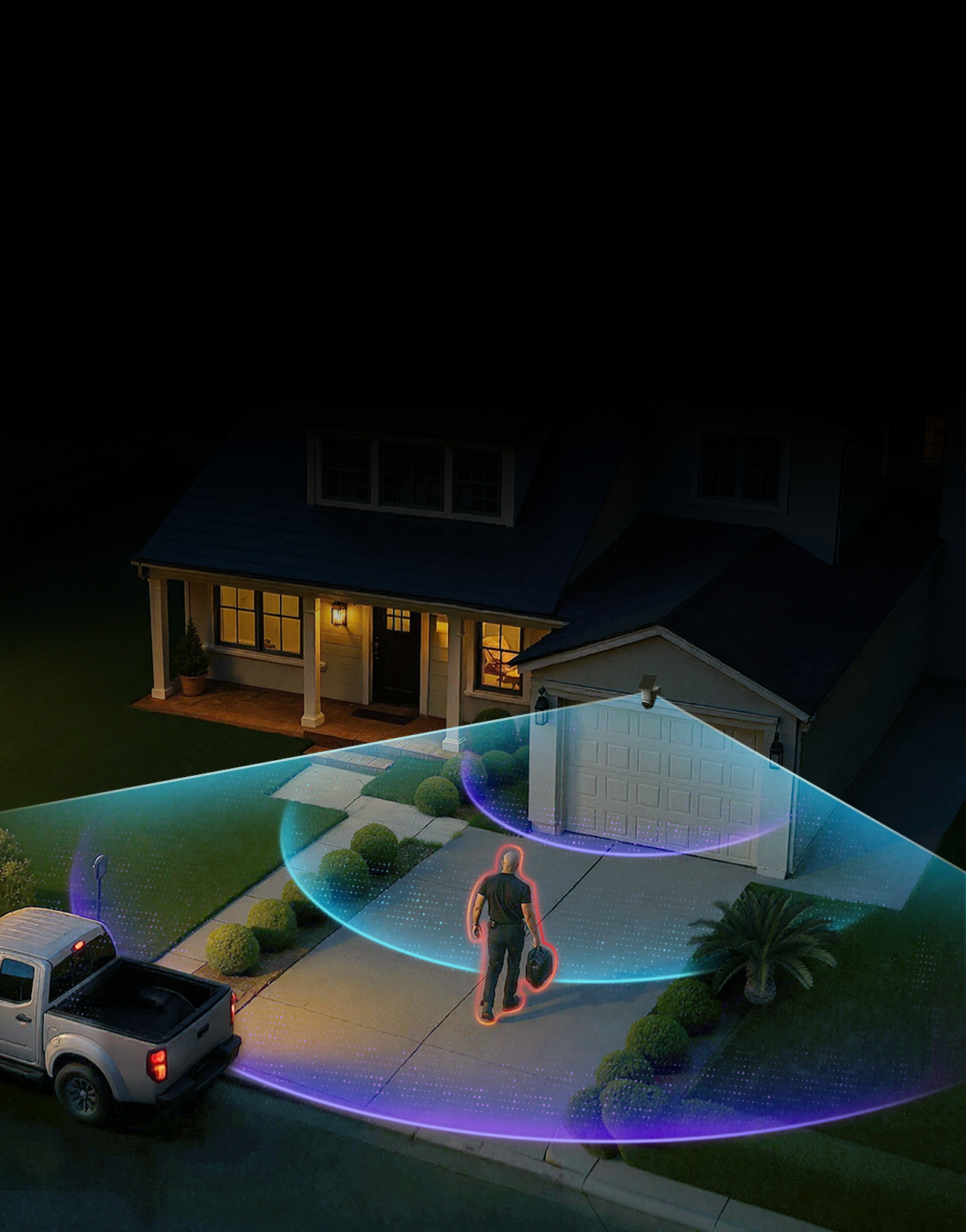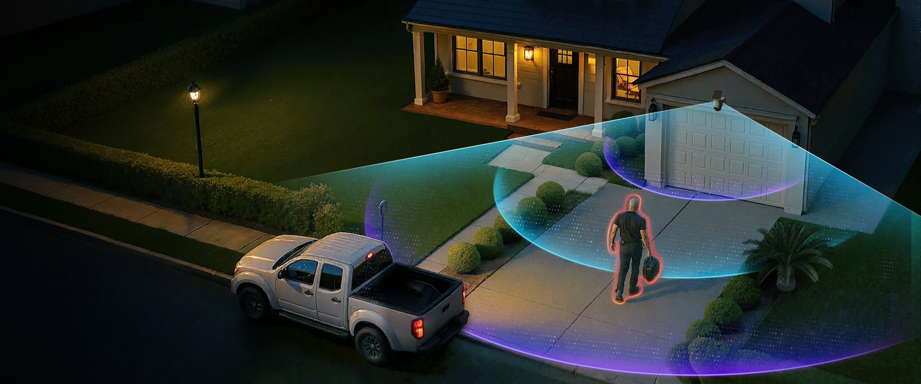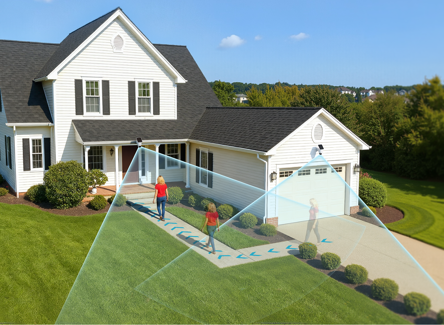 Die Kameras arbeiten zusammen, um Bewegungen rund um Ihr Grundstück zu verfolgen. Eine Kamera setzt genau dort fort, wo die andere aufgehört hat, wie Sicherheitskräfte, die jede Ecke überwachen.